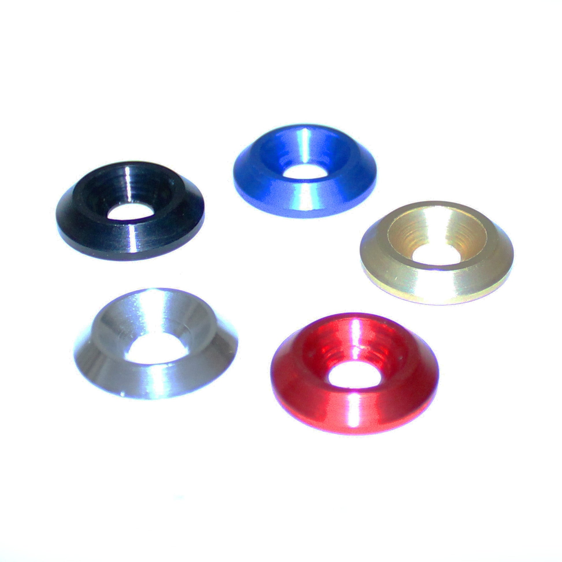 M6 Countersunk washers produced from aerospace grade aluminium and anodised in a choice of 5 different colours