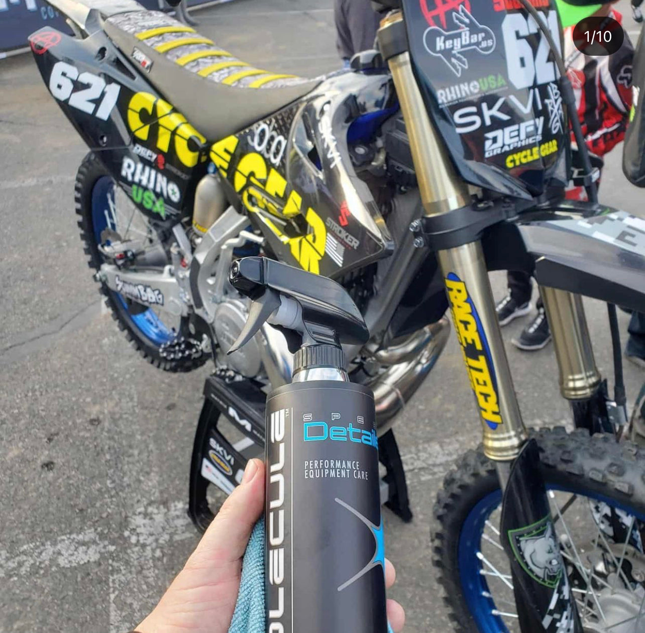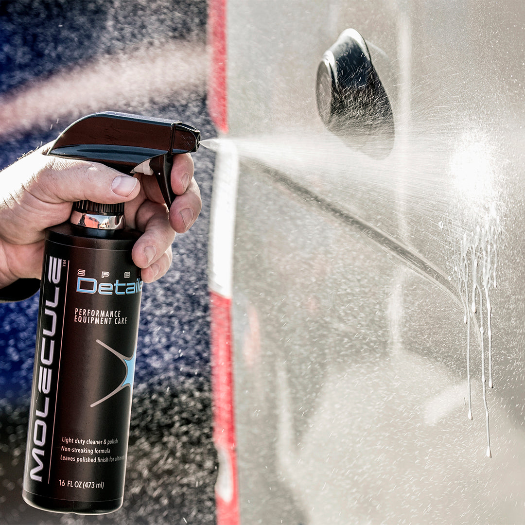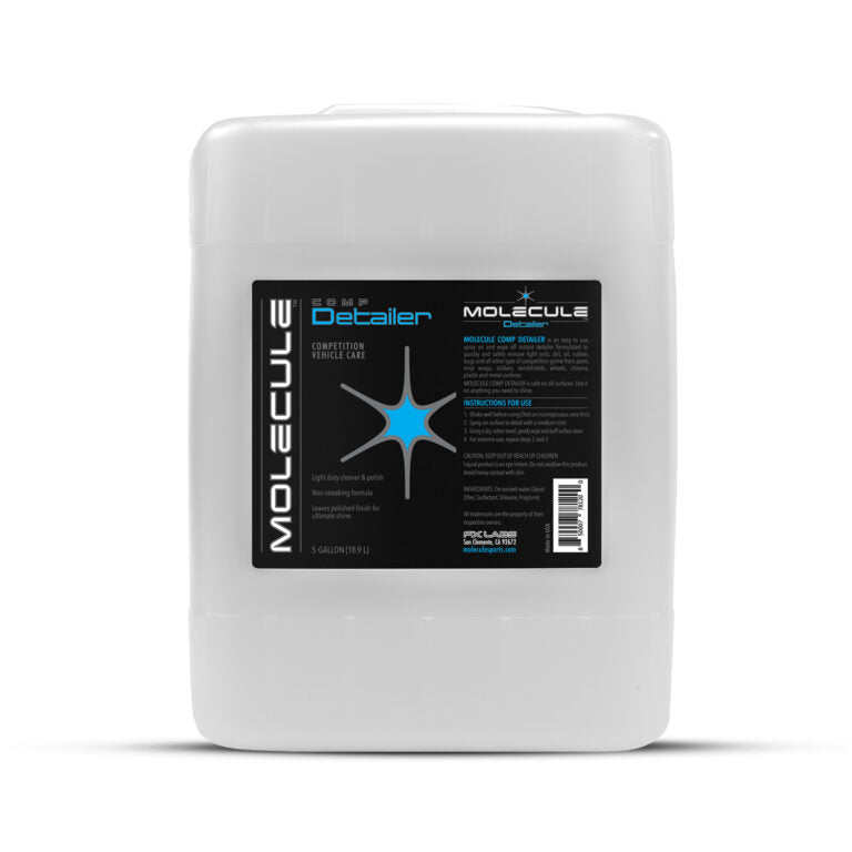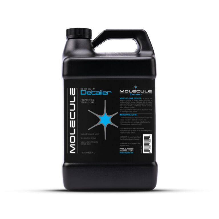 MOLECULE COMP DETAILER is an easy to use instant detailer, spray on and wipe off solution. Formulated to quickly and safely remove light soils, DETAILER’s primary function is to leave a shiny, gloss finish while also resisting any soils from sticking to the surface. Can be used on paint, vinyl wraps, stickers, windshields, wheels, chrome, plastic and metal surfaces. Use it on anything you need to shine.