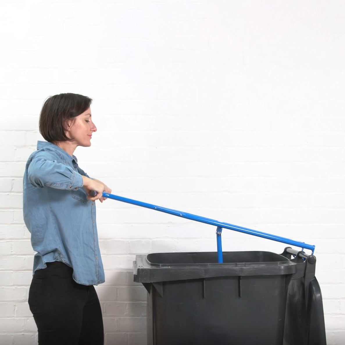 - Place the pusher on top of the rubbish and locate hooks over bin handles
